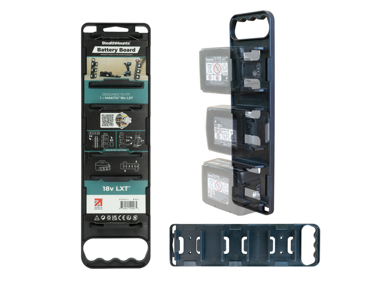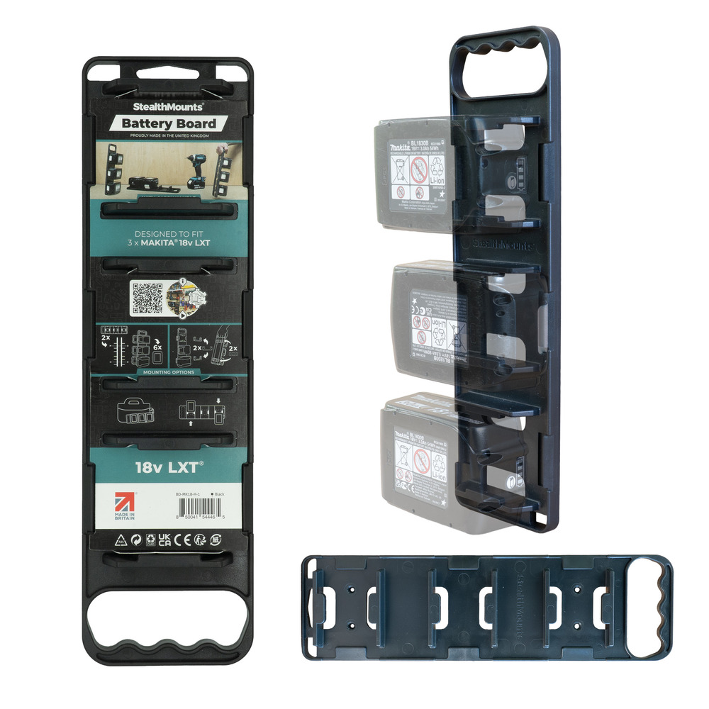 StealthMounts Makita LXT Battery Boards can securely store up to three batteries. Perfect for transporting your batteries to and from the jobsite. Batteries can be mounted from either direction and won't fall out when being carried around. The board has four countersunk holes and two blind holes opening up more mounting and storage options. Two boards can be combined back to back allowing up to six batteries to be carried. Rivet our Mounting Feet to the rear of the Battery Board and hang in your workshop or tool trailer using our Mounting Cleats. Attach a Bench Belt to the rear of your Battery Board and you have instant storage and transportation for your impact driver or tape measure. Bolt to a Milwaukee or Dewalt board if you use more than one platform. Attach Mounting Feet and clip to your Packout System. The possibilities are endless.