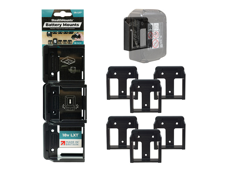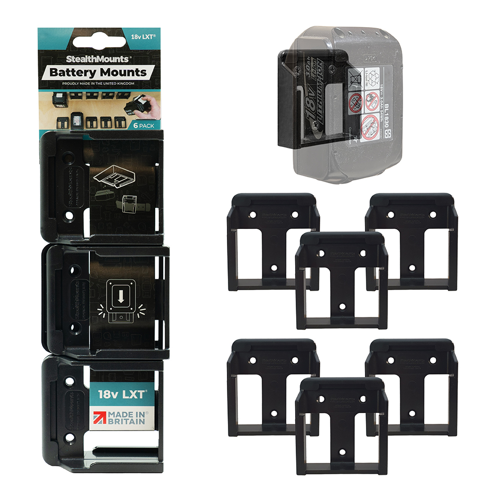 StealthMounts Battery Mounts for Makita 18v LXT cordless batteries keep your batteries organised and exactly where you need them. Batteries fit by clicking into the holder and are only released by pressing the release button on the battery. Batteries can be held at any angle locked in the holder and will not fall out even whilst travelling. Perfect for mobile setups or workshops! Manufactured in the United Kingdom our Makita 18v LXT Battery Mounts are made using extremely durable injection moulded ABS plastic with countersunk screw holes to allow for firm mounting on multiple surfaces. Great for keeping track of your batteries and staying organised. They can be mounted at any distance from one another and in tight spaces for maximum workshop efficiency. Mount them in your workshop, under shelves, toolboxes, tool trailers or in your work vehicles with due care. They can also be looped through a belt for use on the job site. StealthMounts Battery Mounts are available colour coded to match your Makita platform.