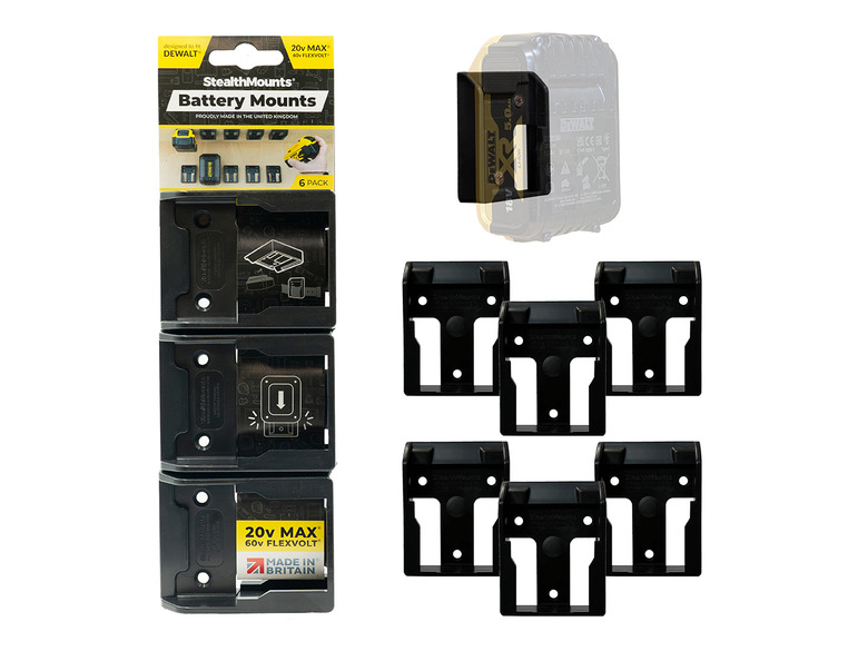 StealthMounts Battery Mounts for Dewalt 20v cordless batteries keep your batteries organised and exactly where you need them. Batteries fit by clicking into the holder and are only released by pressing the release button on the battery. Batteries can be held at any angle locked in the holder and will not fall out even whilst travelling. Perfect for mobile setups or workshops! Manufactured in the United Kingdom our Dewalt 20v Battery Mounts are made using extremely durable injection moulded ABS plastic with countersunk screw holes to allow for firm mounting on multiple surfaces. Great for keeping track of your batteries and staying organised. They can be mounted at any distance from one another and in tight spaces for maximum workshop efficiency. Mount them in your workshop, under shelves, toolboxes, tool trailers or in your work vehicles with due care. They can also be looped through a belt for use on the job site. StealthMounts Battery Mounts are available colour coded to match your Dewalt platform.