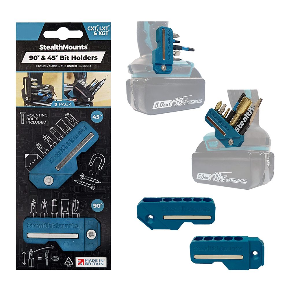 StealthMounts 45° & 90° Bit Holders for Makita CXT, LXT & XGT are the perfect addition for your drill or impact driver. Both the 45° angled Bit Holder and one 90° angled Bit Holder, providing two options of storage for impact bits and screws. Both bitholders provide easy access to impact bits, keeping them organised and on your drill or impact driver. Each magnetic bitholder can hold up to 5 bits ensuring you never lose track of your most needed impact bits. The 45° angled Bit Holder can also hold a carpenters pencil for extra efficiency. Both bit holders are designed specifically for use with Makita Tools, providing a close and secure fit. The appropriate screw for mounting to your Makita CXT, LXT & XGT tools is included. The exposed magnet allows for extra storage of bits and screws and easy mounting on either side of the drill. Made in Great Britain our 45° & 90° Makita CXT, LXT & XGT Bit Holders are made with extremely durable injection moulded ABS plastic.