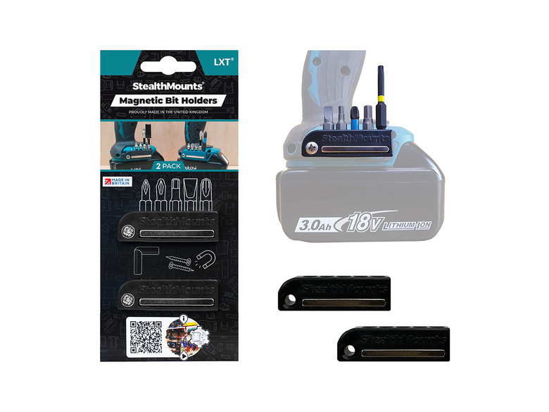 StealthMounts Bit Holders for Makita LXT & XGT are the perfect addition for your drill or impact driver. This bitholder keeps your bits together, organised and on your drill or impact driver. Our Makita LXT & XGT Bit Holders come in a pack of 2. Each magnetic bitholder can hold up to 5 bits allowing you to access your most common drill bits ensuring that you never lose track of them. The appropriate screw for mounting to most of your Makita LXT & XGT tools is provided. The magnet allows the bitholder to be mounted to the tool at different angles, extra screws can also be stored on the side of the magnet. Bits wont fall out even when the holder is mounted upside down. Made in Great Britain our Makita LXT & XGT Bit Holders are made with extremely durable injection moulded ABS plastic.