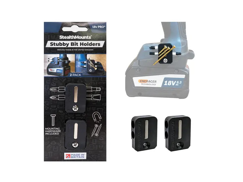 StealthMounts Stubby Bit Holders for Bosch Tools are the perfect addition for your drill or impact driver. These Bit Holders can be mounted on either side of your drill or impact driver and are designed to be used by left-handed and right-handed people with equal ease. Compact and completely out of the way of the drill grip, the Stubby bitholder holds up to 4 bits, with an exposed magnet on both sides, allowing extra storage of bits and screws. StealthMounts Stubby Bit Holders come in a pack of 2 and are moulded specifically to Bosch tools for a close and secure fit. The appropriate screw for mounting to your Bosch is included. Made in Great Britain our Stubby Bosch Bit Holders are made with extremely durable injection moulded ABS plastic.