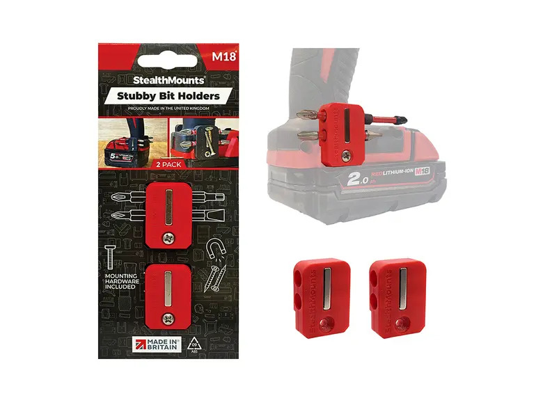 StealthMounts Stubby Bit Holders for Milwaukee M18 Tools are the perfect addition for your drill or impact driver. These Bit Holders can be mounted on either side of your drill or impact driver and are designed to be used by left-handed and right-handed people with equal ease. Compact and completely out of the way of the drill grip, the Stubby bitholder holds up to 4 bits, with an exposed magnet on both sides, allowing extra storage of bits and screws. StealthMounts Stubby Bit Holders come in a pack of 2 and are moulded specifically to Milwaukee tools for a close and secure fit. The appropriate screw for mounting to your Milwaukee M18 is included. Made in Great Britain our Stubby Milwaukee Bit Holders are made with extremely durable injection moulded ABS plastic.