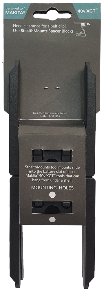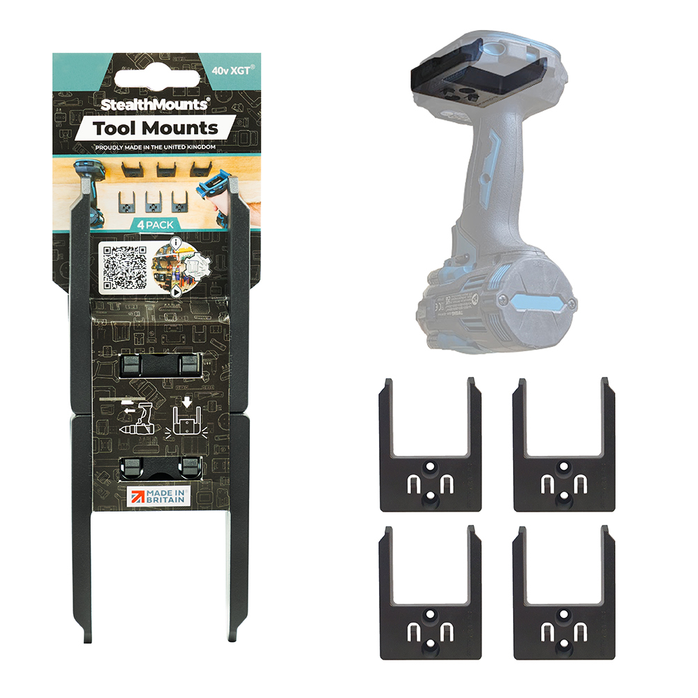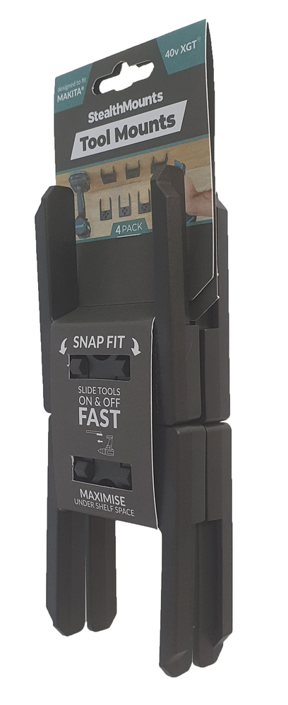 StealthMounts Tool Mounts for Makita 40v XGT cordless tools keep your tools organised and right where you need them. Tools are held securely using our Snap-Fit system, simply slide you tool onto the holder until you hear a click. Made in Great Britain our Makita 40v XGT Tool Mounts are made using extremely durable injection moulded ABS plastic with countersunk screw holes to allow for secure mounting. Ideal for keeping track of you tools and staying organised. They can be mounted at any distance from one another and in small spaces for maximum workshop efficiency. Rated for use in your workshop and under shelves. They can be used in tool trailers or in your work vehicles with due care. Easily release your tool by pulling it off the mount. Available to match your colour coded Makita platform.