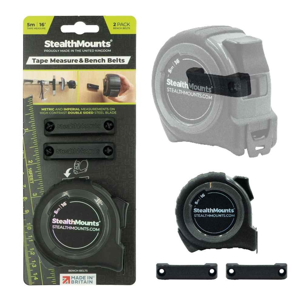- Bench Belts Compatible: Comes with our unique StealthMounts Bench Belts, allowing you to securely mount your tape measure to workbenches, tool boards, or van shelving for quick grab-and-go access.