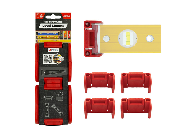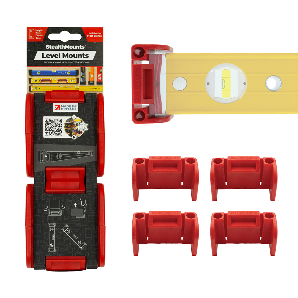 StealthMounts Level Mounts are universal holders that will fit 90% of levels on the market (maximum height of 62mm (2 7/16) and a maximum depth of 32mm (1 ¼). StealthMounts Universal Level Holders are compatible with many top brand levels including: Stabila, Empire, SOLA, Milwaukee, Stanley, Stanley FatMax, DeWalt, Irwin plus many more. This allows you to keep your levels organised and easily accessible within your workshop. The universal Level Mounts can be mounted to any surface with screws without allowing excessive level movement. Each pack contains 2 sets of Universal Level Mounts. StealthMounts Level Mounts can be held vertically or horizontally. Made in Great Britain our Level Mounts are made with extremely durable injection moulded ABS plastic with countersunk screw holes to allow for firm mounting.
